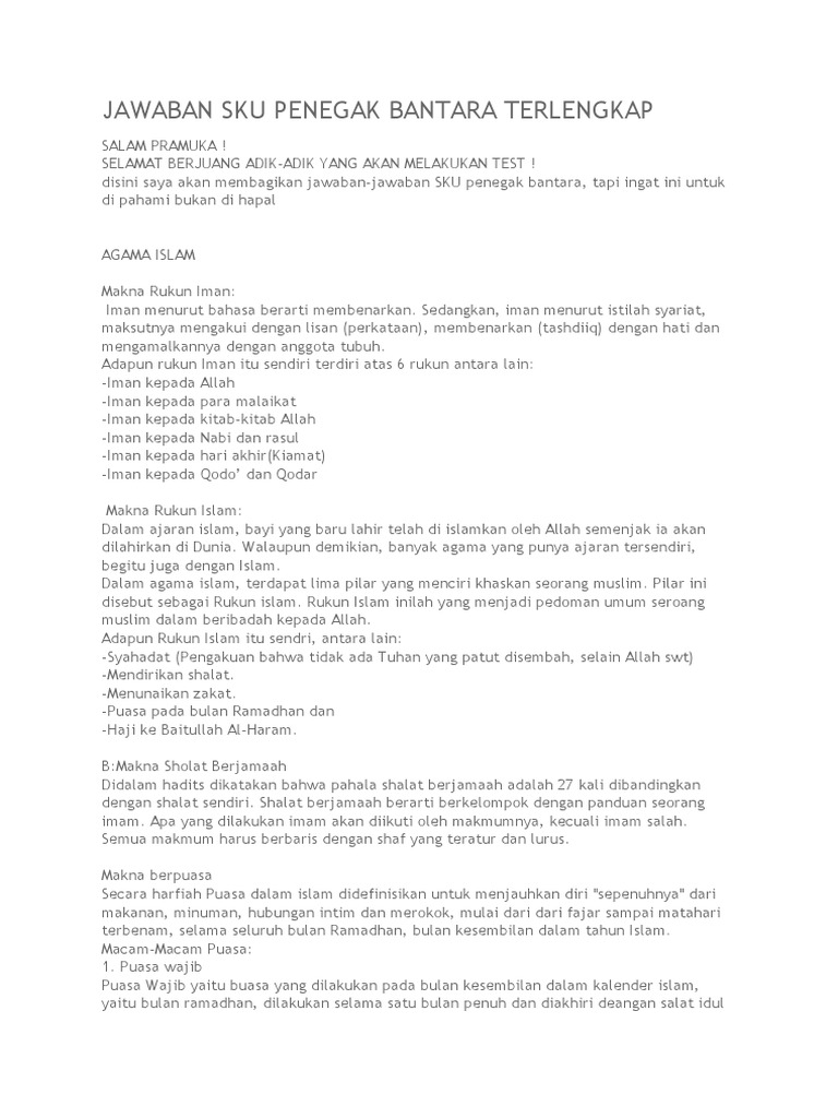 Jawaban sku pramuka penegak bantara selasa, 21 oktober 2014. Panduan materi sku penegak bantara ini telah disesuaikan dengan ketentuan terbaru tentang sku pramuka sebagaimana tertuang dalam sk kwarnas nomor 199 tahun 2011 tentang panduan penyelesaian sku golongan penegak. Tahu tata cara merawat atau mengurus. Sedangkan, iman menurut istilah syariat, maksutnya mengakui dengan lisan (perkataan), membenarkan (tashdiiq) dengan hati dan mengamalkannya dengan anggota tubuh. Dan kalian pun akan bisa menemukan kemenangan yang besar dengan game yang fair dimana player vs player. Panduan penyelesaian 2 syarat kecakapan umum penegak panduan. Jawaban sku penegak bantara terlengkap. Mampu menjelaskan makna sholat berjamaah dan dapat mendirikan sholat sunah secara individu. Dan tku ini merupakan kebanggaan tersendiri bagi seorang anggota pramuka saat memakainya. Panduan materi ini lengkap dengan syarat dan indikator yang harus dicapai untuk dapat menyelesaikan materi ujian sku penegak bantara. Pada kesempatan kali ini, halo pramuka akan berbagi isi dari sku golongan penegak, mulai dari tingkat bantara hingga laksana. Dapat menjelaskan makna rukun iman dan rukun islam. Dapat menjelaskan makna rukun iman dan rukun islam 2.