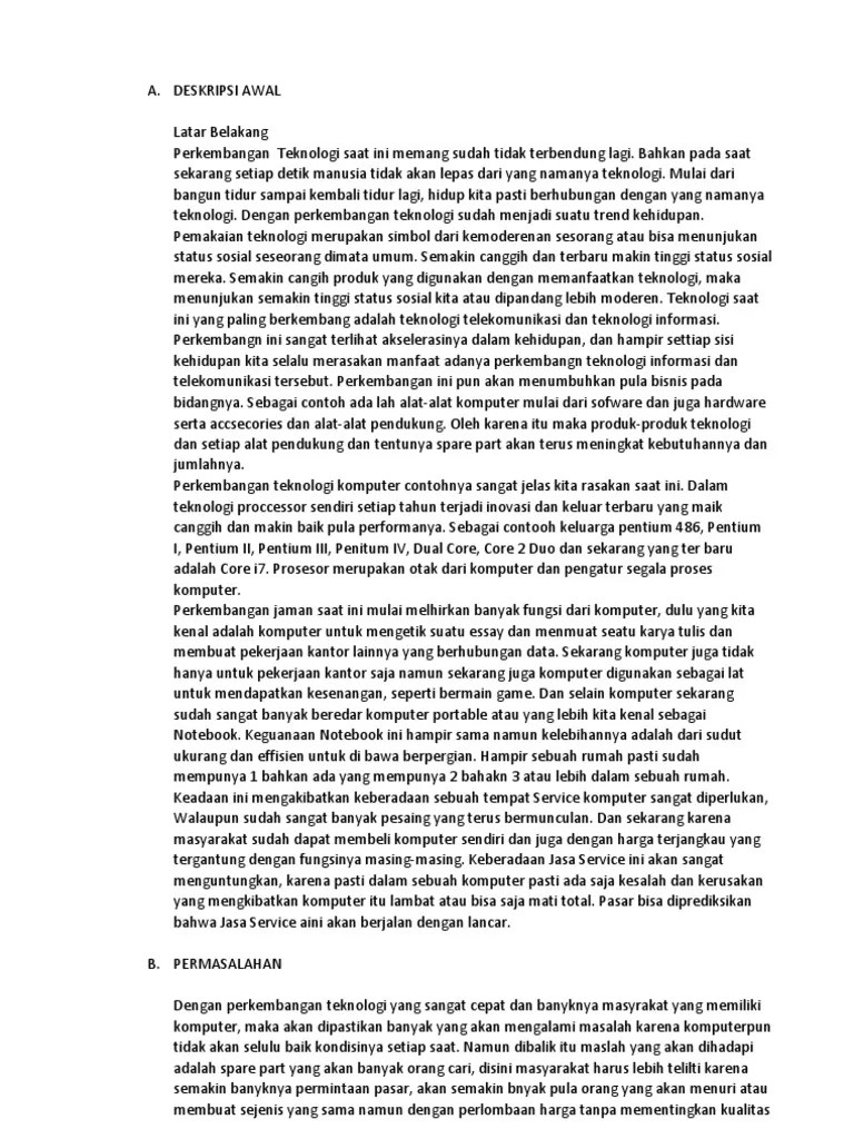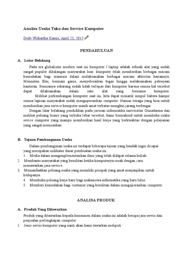 Laporan studi kelayakan bisnis service komputer bersama surat ini kami kirimkan proposal studi kelayakan bisnis dalam bidang usaha service komputer. Contoh proposal usaha jasa service komputer. Pendahuluan 1latar belakang dan motivasi melakukan usaha 11 latar belakang teknologi komputer dan printer yang ada sekarang telah memungkinkan kita untuk mencetak tidak hanya teks dan gambar sederhana namun. Gayung bersambut, ling nya nyambung, connect. Contoh proposal usaha makanan ringan posted by akira yuki jumat 10 mei 2013 0 comments bab 1 pendahuluan a.