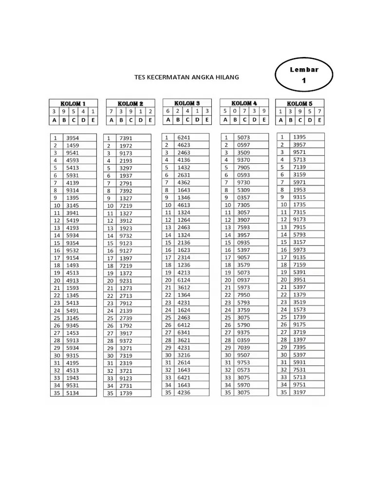 Prediksi soal kecermatan angka ada 1 angka hilang 4 huruf . Huruf hilang memiliki dua jenis model, yaitu huruf kecil semua ataukah huruf. Tes kecermatan angka hilang pdf. Lembar 1 staf pengembangan soal tes psikologi bimbe polri_____ soal kecermatan setukpa polri kolom 1 kolom 2 kolom. Huruf hilang memiliki dua jenis model, yaitu huruf kecil semua ataukah huruf.